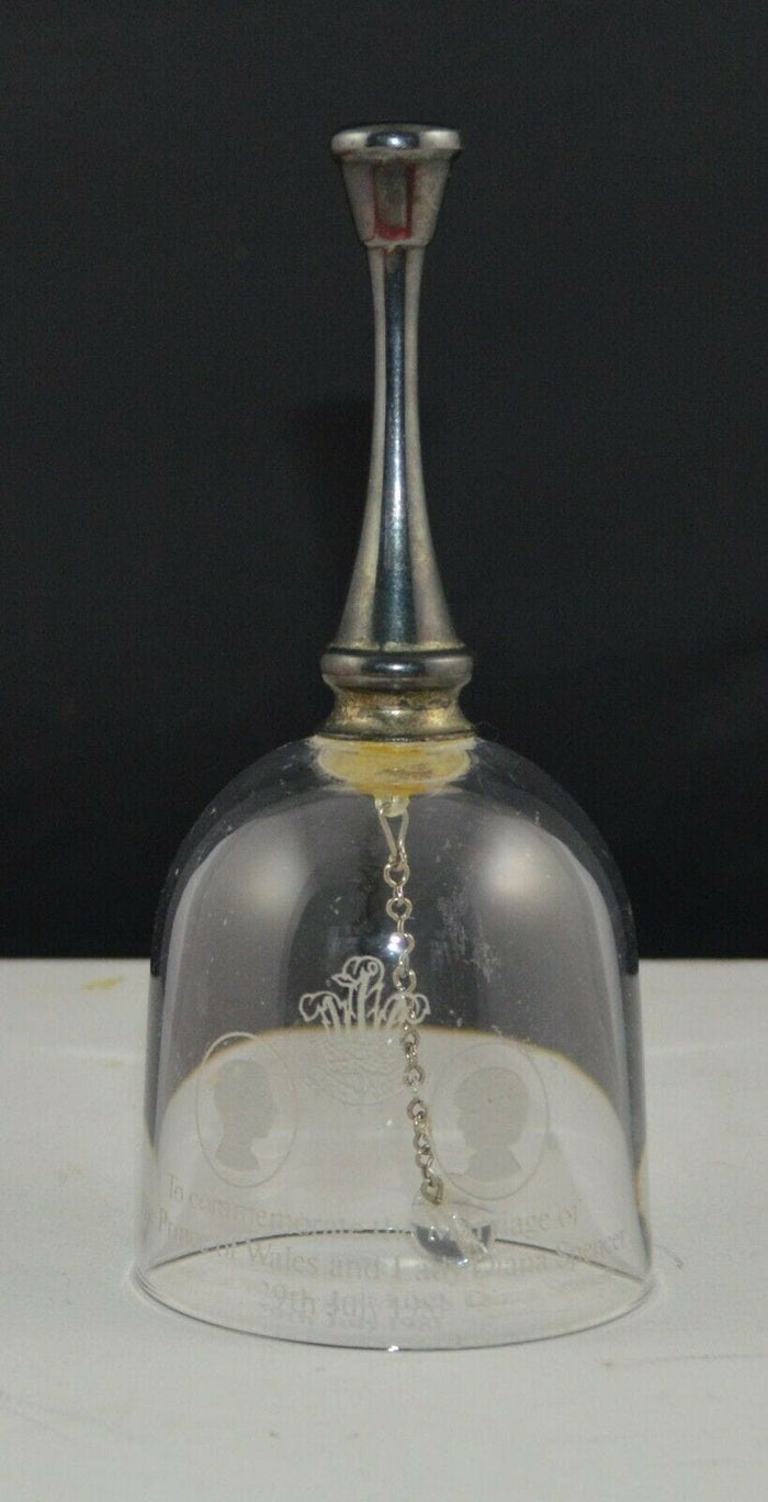 This previously owned commemorative glass bell celebrates the royal wedding of Prince Charles and Lady Diana. It is in good condition with some signs of repair and wear. A great addition for collectors of royal memorabilia.